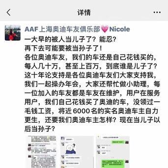 而奥迪某车友会会长则表示杠杆网资本分配,这些年来,作为用户,奥迪给的体验感非常差,且不是他一个人这么认为,你没有经历过奥迪车友会的线下活动工作人员和车友开辩论赛和白眼,可能大家立场不同。我是车主我肯定站在用户群角度来发声,至于“儿不嫌母丑”这句话用的并不恰当,我不是奥迪的儿,我也不是奥迪的员工,我没有领过一毛钱工资。如果非要以这种关系来说,那么顾客和品牌的关系,到底谁是儿?